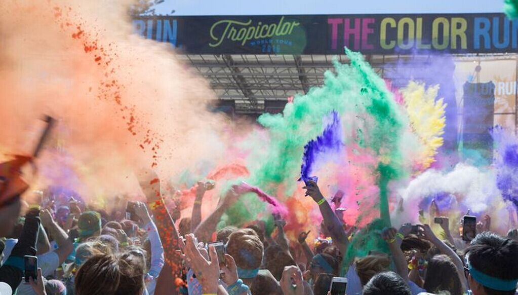 La gente lanza polvo de colores tras la Carrera de Colores en Sydney, Australia, el 21 de agosto de 2016. La Carrera de Colores, conocida como "los 5km más felices del planeta", se celebró en Sydney el domingo. Es un evento único que pretende concienciar sobre la salud y la felicidad. En el evento, los participantes terminan cubiertos de una mezcla de polvos de colores hechos de almidón de maíz. (Xinhua/Zhu Hongye)
