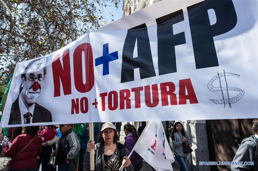 SANTIAGO, agosto 21, 2016 (Xinhua) -- Una manifestante sostiene una pancarta, durante la multitudinaria marcha nacional "No Más AFP" convocada por la Coordinadora Nacional de "No Más AFP" y otras organizaciones sociales, en Santiago, capital de Chile, el 21 de agosto de 2016. La marcha tiene como objetivo fundamental rechazar el funcionamiento de las Administradores de Fondos de Pensiones (AFP), y como principales demandas, crear un sistema de Seguridad Social, de reparto, solidario y financiamiento tripartito (trabajadores, empresas y Estado), que pague pensiones que alcancen para vivir bien a los jubilados y rechazar el funcionamiento de las AFP, según los organizadores. (Xinhua/Jorge Villegas)