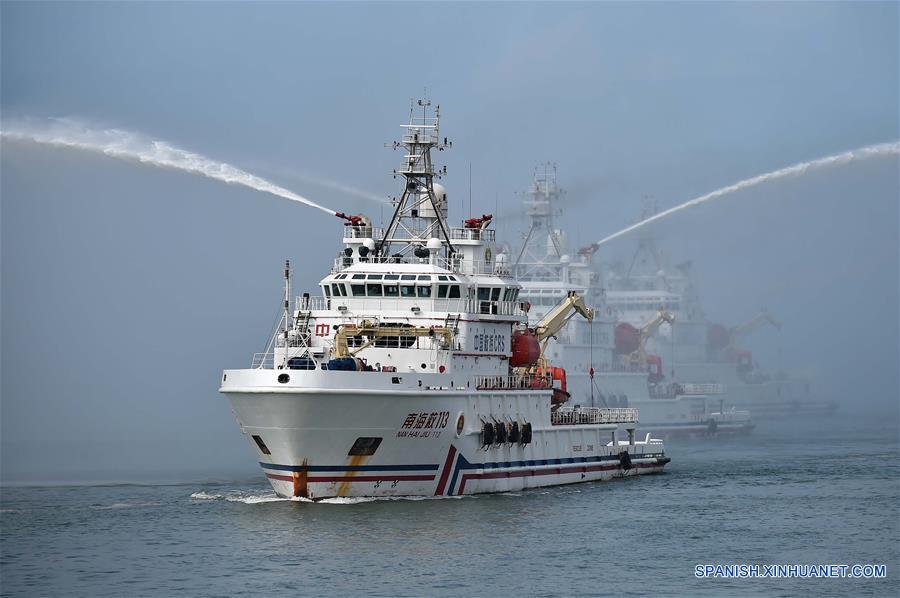 Buques de rescate participan durante un simulacro de rescate de emergencia llevado a cabo en la zona del mar cerca de la isla Fenghuang en Sanya, provincia de Hainan, en el sur de China, el 23 de agosto de 2016. El simulacro está destinado a mejorar la capacidad de respuesta de emergencia de los equipos de salvamento marítimo. (Xinhua/Guo Cheng)
