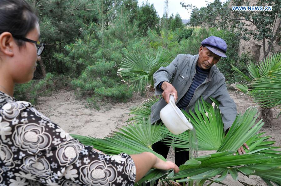 Xu Zhiqiang, con la ayuda de su nieta, riega las plantas y árboles plantados en una monta?a de la aldea Zhangchuan en el condado Tongwei, provincia de Gansu, el 23 de agosto de 2016. Xu Zhiqiang y su hermano gemelo Xu Zhigang llevan 48 a?os plantando voluntariamente árboles en las colinas estériles en la meseta Loess. Más de 350 mu (23 hectáreas) de tierras yermas han vuelto a ser verdes gracias la plantación de más de 80.000 árboles y flores. Los esfuerzos de los hermanos no sólo ayudan a crear belleza natural sino también a mejorar el ecosistema local. (Xinhua/Guo Gang)