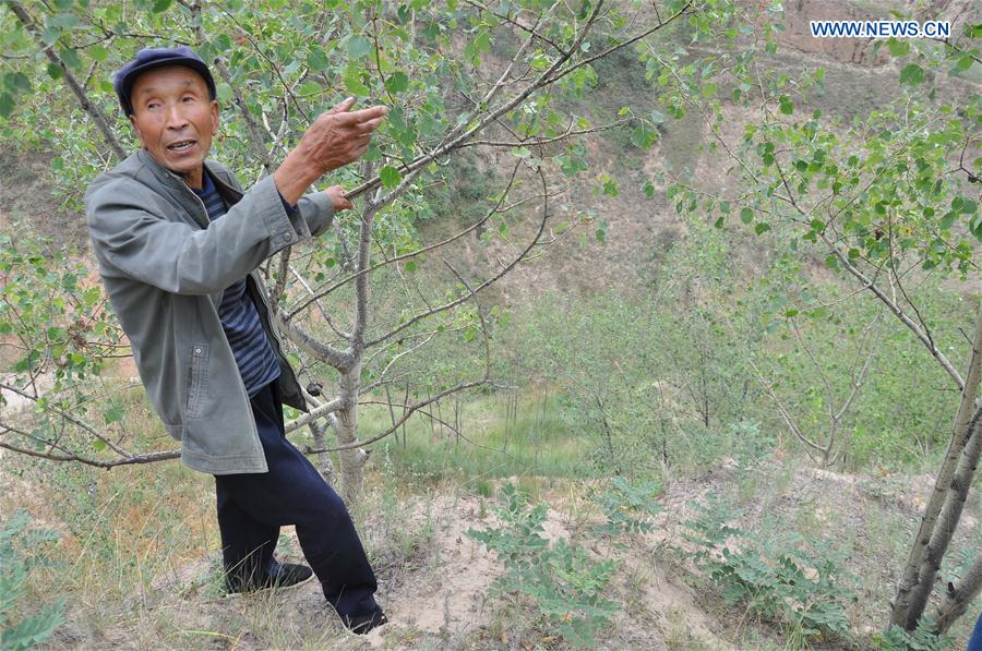 Xu Zhiqiang, de 68 a?os, habla sobre su experiencia con la plantación de árboles en una monta?a de la aldea Zhangchuan en el condado Tongwei, provincia de Gansu, el 23 de agosto de 2016. Xu Zhiqiang y su hermano gemelo Xu Zhigang llevan 48 a?os plantando voluntariamente árboles en las colinas estériles en la meseta Loess. Más de 350 mu (23 hectáreas) de tierras yermas han vuelto a ser verdes gracias la plantación de más de 80.000 árboles y flores. Los esfuerzos de los hermanos no sólo ayudan a crear belleza natural sino también a mejorar el ecosistema local. (Xinhua/Guo Gang)