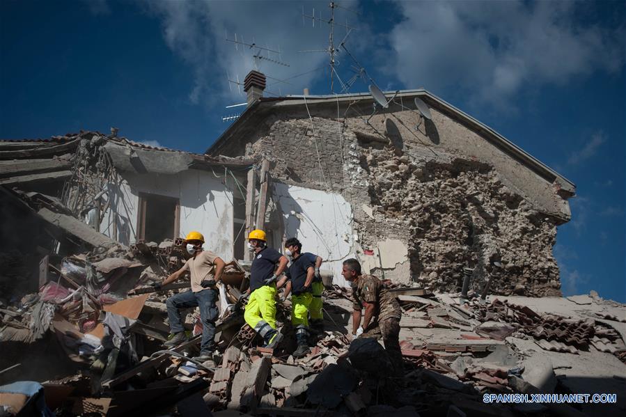 Rescatistas trabajan en la búsqueda de sobrevivientes en los escombros de una casa luego de un sismo en la localidad de Amatrice, provincia de Rieti, en el centro de Italia, el 24 de agosto de 2016. Al menos 120 personas han muerto a causa de un fuerte sismo ocurrido el miércoles en el centro de Italia, dijo en una conferencia de prensa en Rieti el primer ministro italiano Matteo Renzi. Un sismo de magnitud 6.2 en la escala de Richter, con una profundidad de 4.2 kilómetros, sacudió a las 03:36 hora local de hoy (01:36 GMT) una zona monta?osa cercana a la ciudad de Rieti, a cerca de 140 kilómetros al noreste de Roma, informó el Instituto Nacional de Vulcanología y Sismología (INGV). (Xinhua/Ivan Romano/Pacific Press/ZUMAPRESS)
