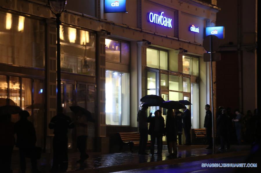 Personas permanecen frente al banco donde ocurrió un secuestro, en Moscú, Rusia, el 24 de agosto de 2016. Cuatro empleados de un banco del centro de Moscú fueron tomados como rehenes dentro del banco. De los cuatro empleados retenidos, dos mujeres fueron liberadas. Las fuerzas del orden han llegado ya al lugar de los hechos. Aún se desconoce la identidad de los responsables, informaron medios locales. (Xinhua/Evgeny Sinitsyn)