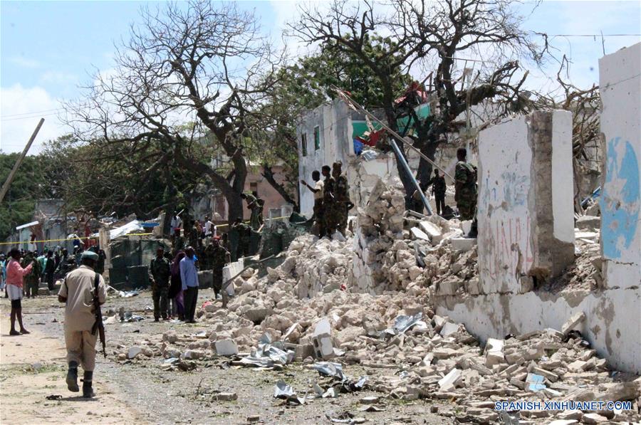 Personas se reúnen en el lugar de la explosión, en Mogadiscio, capital de Somalia, el 30 de agosto de 2016. Al menos dos personas murieron y varias más resultaron heridas el martes en una explosión cerca del SYL Hotel, el cual está muy próximo al palacio presidencial de Mogadiscio, capital de Somalia, informó la policía. (Xinhua/Faisal Isse)
