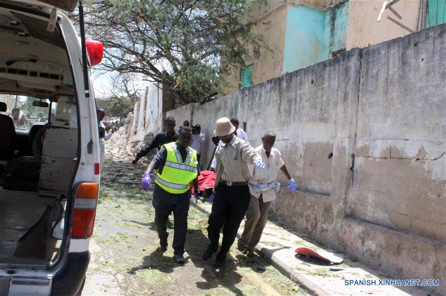 Personas trasladan el cuerpo de una víctima en el lugar de la explosión, en Mogadiscio, capital de Somalia, el 30 de agosto de 2016. Al menos dos personas murieron y varias más resultaron heridas el martes en una explosión cerca del SYL Hotel, el cual está muy próximo al palacio presidencial de Mogadiscio, capital de Somalia, informó la policía. (Xinhua/Faisal Isse)