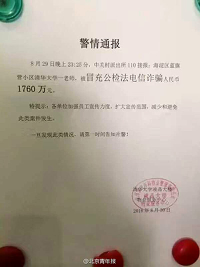 Beijing, 01/09/2016(Pueblo en Línea)-Un aviso que alerta a los residentes del fraude telefónico, publicado por un centro de servicios de la Universidad Tsinghua, ha causado recientemente una gran sensación en Internet.
