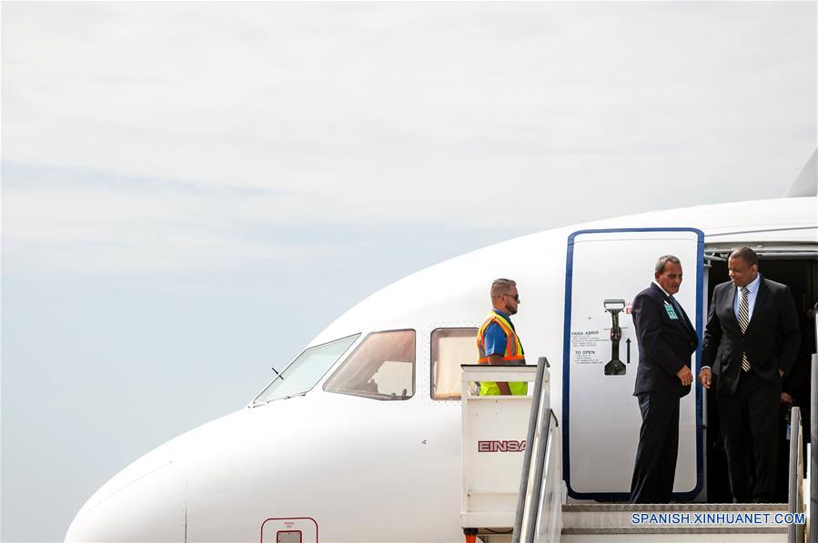 El secretario de Transporte de Estados Unidos de América, Anthony Foxx (d), sale del primer vuelo regular entre Cuba y Estados Unidos de América en 55 a?os en el Aeropuerto Internacional Abel Santamaría, en Santa Clara, provincia de Villa Clara, Cuba, el 31 de agosto de 2016. El Airbus A320 de la compa?ía estadounidense JetBlue tocó pista el miércoles a las 10:57 tiempo local (14:57 GMT) en el aeropuerto internacional Abel Santamaría de la ciudad cubana de Santa Clara en la provincia de Villa Clara (centro). La llegada de la aeronave procedente de Fort Lauderdale (Florida), inauguró formalmente los vuelos regulares directos entre Cuba y Estados Unidos de América. (Xinhua/Liu Bin)