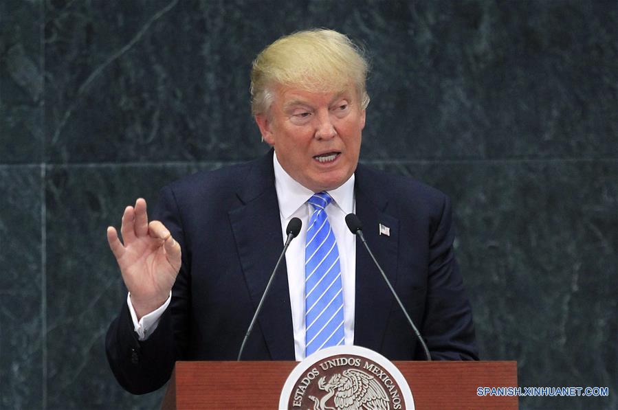 El candidato republicano a la presidencia de Estados Unidos de América, Donald Trump, participa durante una conferencia de prensa con el presidente mexicano Enrique Pe?a Nieto tras una reunión privada, en la Residencia Oficial de Los Pinos, en la Ciudad de México, capital de México, el 31 de agosto de 2016. El candidato republicano a la presidencia de Estados Unidos de América, Donald Trump, llegó el miércoles a la Ciudad de México para reunirse con el presidente mexicano Enrique Pe?a Nieto a fin de tener un primer acercamiento y hablar sobre la relación bilateral. (Xinhua/Str)