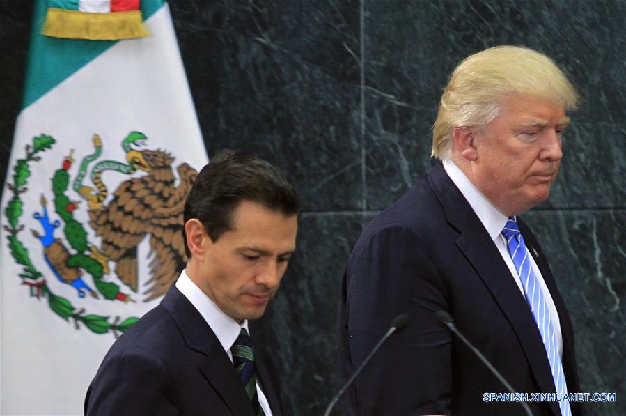 El presidente mexicano Enrique Pe?a Nieto (i), y el candidato republicano a la presidencia de Estados Unidos de América, Donald Trump (d), llegan a una conferencia de prensa en la Residencia Oficial de Los Pinos tras una reunión privada, en la Ciudad de México, capital de México, el 31 de agosto de 2016. El candidato republicano a la presidencia de Estados Unidos de América, Donald Trump, llegó el miércoles a la Ciudad de México para reunirse con el presidente mexicano Enrique Pe?a Nieto a fin de tener un primer acercamiento y hablar sobre la relación bilateral. (Xinhua/Str)