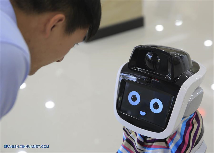 Un residente habla con el robot inteligente Baobao en el Centro de Servicios Administrativos del condado de Baofeng, ciudad de Pingdingshan, provincia de Henan, en el centro de China, el 2 de septiembre de 2016. Actuando como un gerente de recepción, Baobao puede hablar con las personas y responder preguntas acerca del servicio administrativo.