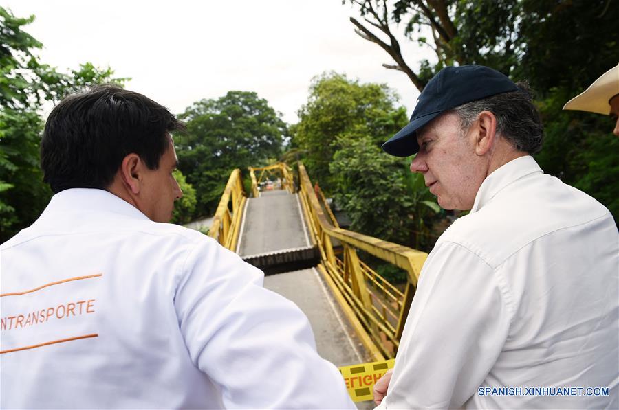 Imagen cedida por Presidencia de Colombia del presidente de Colombia, Juan Manuel Santos (d), conversando con un trabajador en el sitio donde cayó un puente en el departamento de Casanare, Colombia, el 4 de septiembre de 2016. De acuerdo con información de la prensa local, el presidente Juan Manuel Santos visitó Casanare el domingo para supervisar las obras que abren el paso por la carretera principal, luego de la caída del puente El Charte en días pasados, lo que ha dificultado el transporte de materias primas y petróleo en la zona. (Xinhua/Juan Pablo Bello/Presidencia de Colombia)