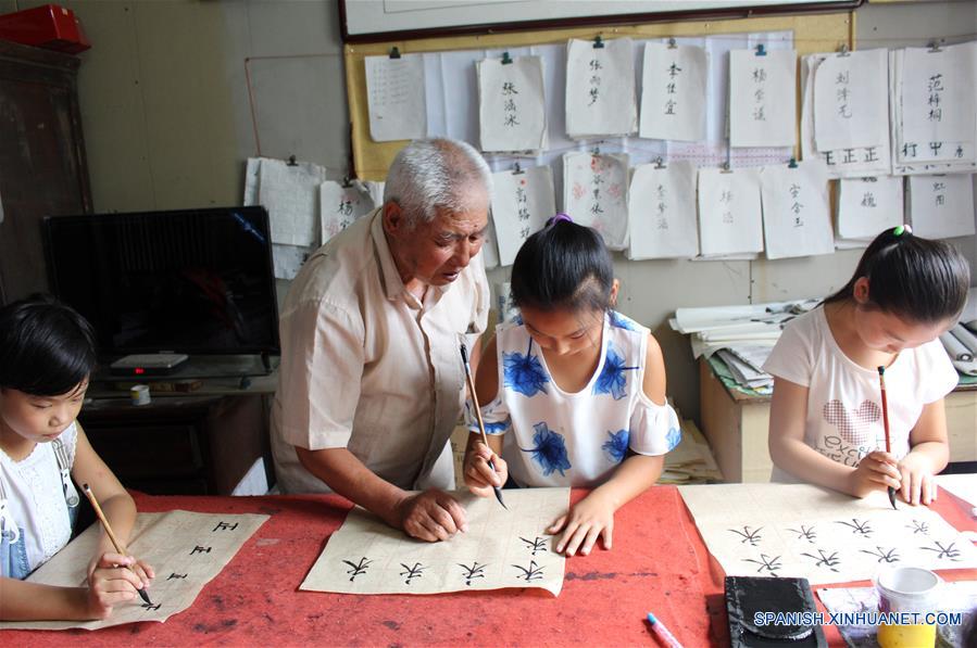 HEBEI, septiembre 7, 2016 (Xinhua) -- Imagen del 6 de septiembre de 2016 de Zhang Xing'en ense?ando a los alumnos a escribir caligrafía en su vivienda en la localidad de Xiguan, en el distrito de Gaocheng de Shijiazhuang, capital de la provincia de Hebei, en el norte de China. Zhang Xing'en, de 81 a?os de edad, ha estado ense?ando caligrafía voluntariamente a los estudiantes de la Escuela Primaria Xiguan en el distrito de Gaocheng por más de tres a?os para incrementar su sensibilidad estética para la caligrafía. (Zhang Jiangang)
