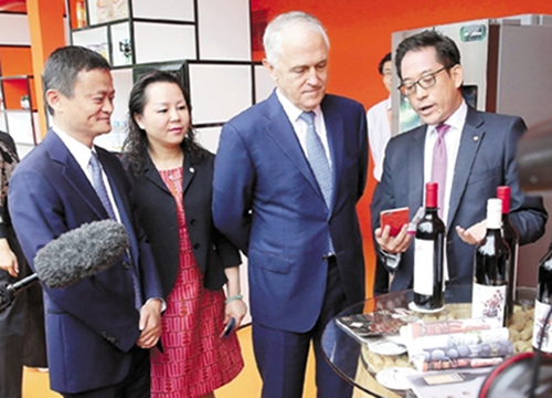 El primer ministro australiano, Malcolm Turnbull, durante su visita a Alibaba atestiguó el acuerdo de cooperación estratégica firmado por Alibaba y la Comisión de Inversiones y Comercio de Australia.