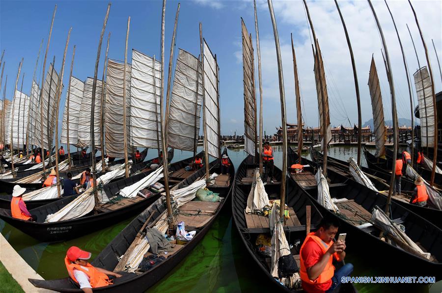 YUNNAN, septiembre 13, 2016 (Xinhua) -- Pescadores se preparan para pescar en el Lago Dianchi en Kunming, capital de la provincia de Yunnan, en el suroeste de China, el 13 de septiembre de 2016. El Lago Dianchi abrió el martes oficialmente la pesca. Este a?o, la pesca se divide en dos periodos. Durante el primer periodo del 13 al 24 de septiembre, los pescadores pueden capturar grandes peces, Mientras que durante el segundo periodo del 29 de septiembre al 23 de octubre, ellos pueden pescar morralla y camarones. (Xinhua/Lin Yiguang)