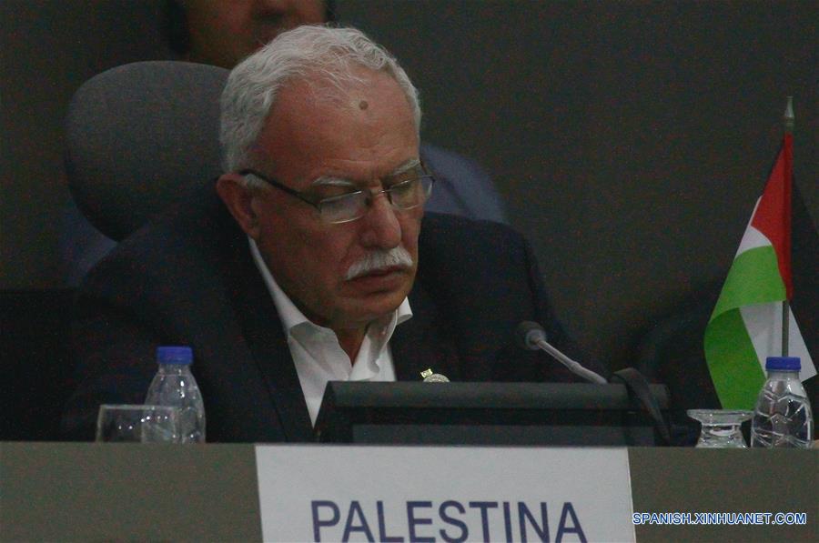 El ministro de Relaciones Exteriores palestino, Riyad al-Maliki, participa durante la plenaria de Cancilleres de la 17 Cumbre del Movimiento de países No Alineados (MNOAL), en la isla de Margarita, Venezuela, el 15 de septiembre de 2016. (Xinhua/Boris Vergara)