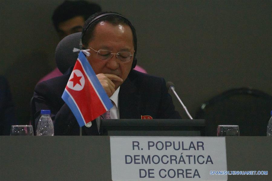 El ministro de Relaciones Exteriores de República Popular Democrática de Corea (RPDC), Ri Yong-ho, participa durante la plenaria de Cancilleres de la 17 Cumbre del Movimiento de países No Alineados (MNOAL), en la isla de Margarita, Venezuela, el 15 de septiembre de 2016. (Xinhua/Boris Vergara)