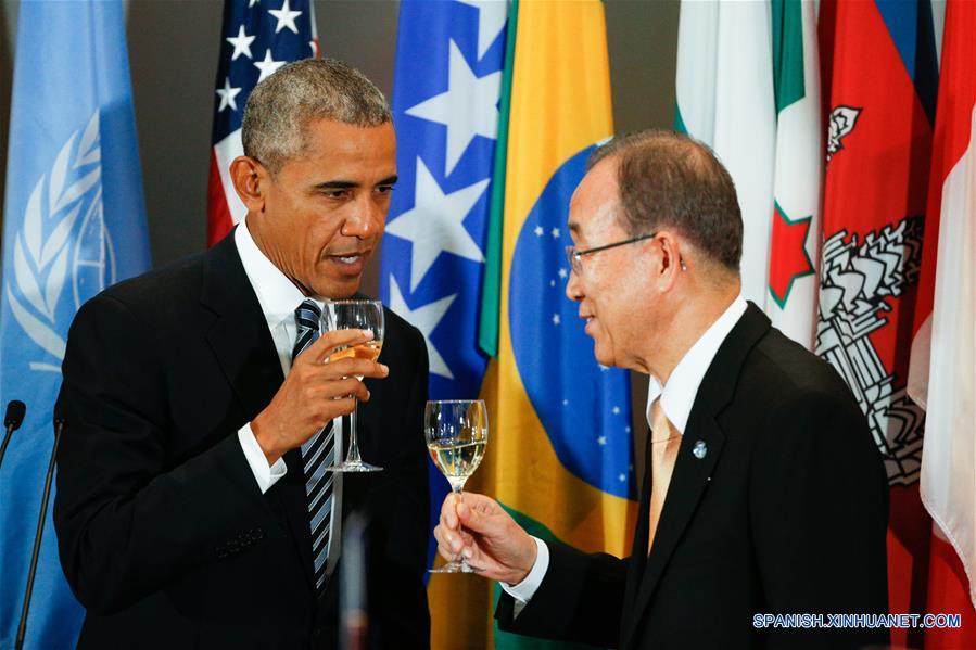 El presidente de Estados Unidos de América, Barack Obama (i), brinda con el secretario general de la Organización de las Naciones Unidas (ONU), Ban Ki-moon (d), durante un almuerzo de jefes de Estado organizado por Ban Ki-moon, en la sede de la ONU, en Nueva York, Estados Unidos de América, el 20 de septiembre de 2016. (Xinhua/Li Muzi)