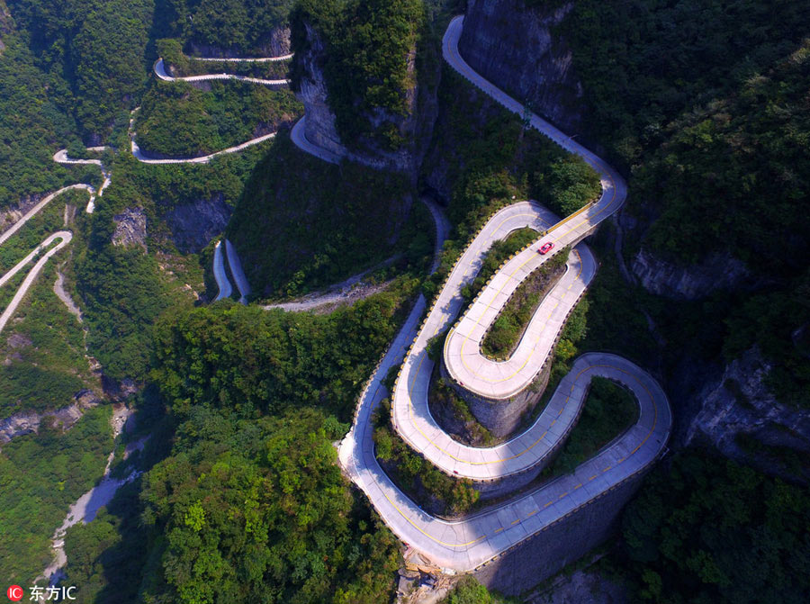 Fabio Barone, que en Italia dirige el club Passione Rossa de propietarios de Ferrari, conduce su Ferrari por la carretera Tongtian de la monta?a Tianmen, Zhangjiajie, provincia de Hunan, el 21 de septiembre de 2016. [Foto: IC]