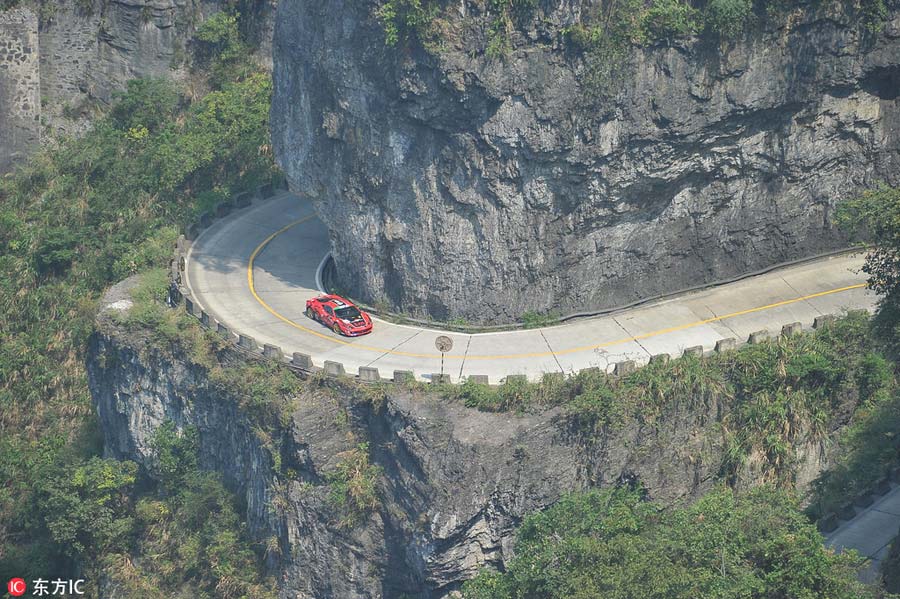 Fabio Barone, que en Italia dirige el club Passione Rossa de propietarios de Ferrari, conduce su Ferrari por la carretera Tongtian de la monta?a Tianmen, Zhangjiajie, provincia de Hunan, el 21 de septiembre de 2016. [Foto: IC]