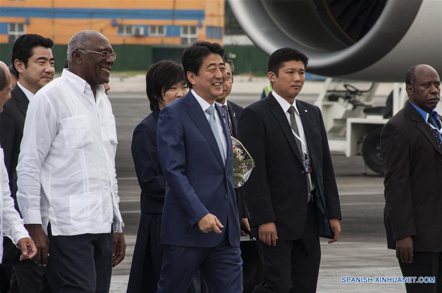 El primer ministro de Japón, Shinzo Abe (c), es recibido por el vicepresidente del Consejo de Estado de Cuba, Salvador Valdés Mesa (i), a su llegada al Aerpuerto José Martí de La Habana, capital de Cuba, el 22 de septiembre de 2016. Shinzo Abe, llegó el jueves a La Habana en la primera visita oficial de primer ministro de Japón a Cuba, un viaje de menos de 24 horas, con el fin de reforzar los vínculos económicos entre los dos países, de acuerdo con información de la prensa local. (Xinhua/Str)