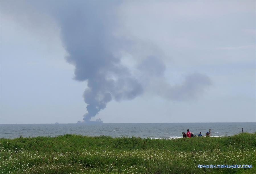 Personas observan una columna de humo que emana del buque tanque "Burgos" de la empresa estatal Petróleos Mexicanos (PEMEX), durante un incendio frente a la costa del municipio de Boca del Río, estado de Veracruz, México, el 24 de septiembre de 2016. Un buque tanque que transportaba combustibles de la empresa PEMEX se incendió el sábado frente a las costas del estado de Veracruz, sin que se registraran heridos, informaron autoridades federales y estatales. PEMEX informó en su cuenta oficial de Twitter que el accidente en la embarcación "Burgos" ocurrió frente a las playas del municipio de Boca del Río, contiguo al puerto de Veracruz, en el golfo de México. El buque se encontraba a unos 9.6 kilómetros de la costa cuando a las 11:30 hora local se registró una explosión que causó el incendio, el cual generó una columna de humo negro de decenas de metros de altura, según los reportes de la Administración Portuaria Integral (API) de Veracruz y de la Secretaría de Protección Civil estatal. De acuerdo con reportes de la prensa local, el buque tanque transportaba 80,000 barriles de diésel, 71,000 de gasolina Magna (87 octanos) y 16,000 de gasolina desulfurada, aunque el dato no ha sido confirmado oficialmente por las autoridades. (Xinhua/Str)