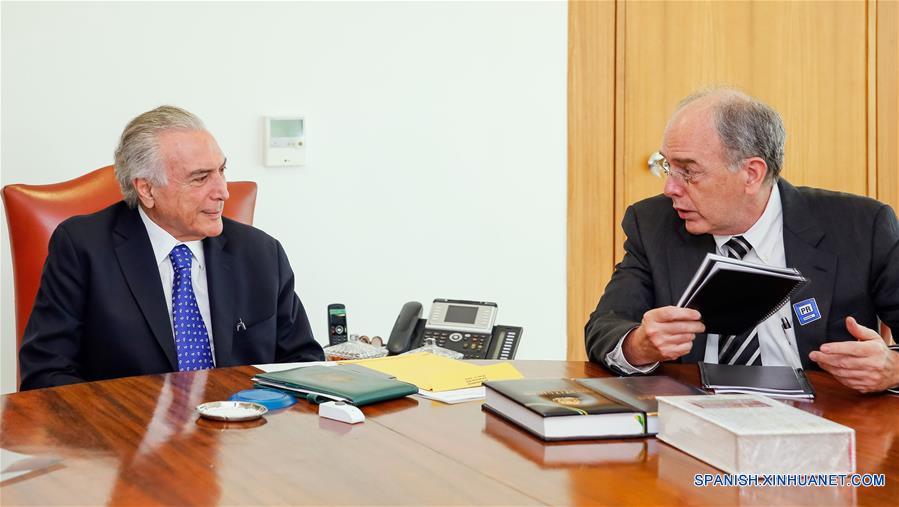 Imagen cedida por la Presidencia de Brasil del presidente brasile?o Michel Temer (i), reuniéndose con el presidente de PETROBRAS, Pedro Parente (d), en Brasilia, capital de Brasil, el 27 de septiembre de 2016. Pedro Parente, defendió el martes el fin de la ley que obliga a la compa?ía a explorar todos los campos de petróleo en el área del presal, donde hay grandes reservas de hidrocarburos. Parente se reunió el martes con Michel Temer, y le presentó el plan de negocios de la compa?ía para los próximos cinco a?os. (Xinhua/Marcos Correa/Presidencia de Brasil)