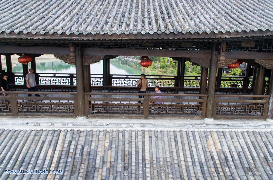 Imagen del 29 de septiembre de 2016 de turistas visitando el puente cubierto que cruza el río Apeng, en Chongqing, en el suroeste de China. La construcción de madera anterior que cubría el puente fue destruida por un incendio en el 2013, y el puente fue reabierto un a?o después luego de su reconstrucción. (Xinhua/Liu Chan)