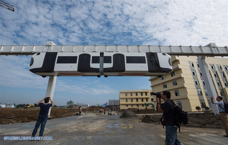 Un tren impulsado por una batería de litio se suspende de una vía férrea en Chengdu, en la provincia de Sichuan, en el suroeste de China, el 30 de septiembre de 2016. La primera vía de suspensión de China terminó su prueba de funcionamiento el viernes. El tren, que corre a una velocidad de 60 kilómetros por hora, se trasladó exitosamente a través de una sección de prueba de 300 metros dentro de la vía. (Xinhua/Jiang Hongjing)