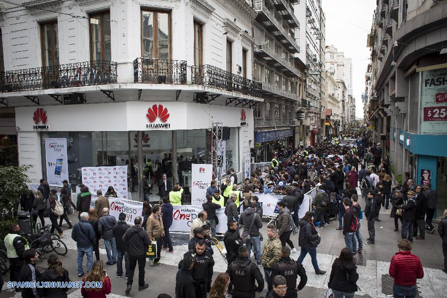 Residentes preseleccionados esperan en una fila frente a un local de la empresa de telecomunicaciones china Huawei, en la ciudad de Buenos Aires, Argentina, el 30 de septiembre de 2016. Largas filas, sillas para descanso, vallados, hombres de seguridad y emoción se registraron el viernes en Buenos Aires (capital) por la decisión del gigante chino de telecomunicaciones Huawei de vender en pleno centro 300 teléfonos inteligentes a un valor simbólico de 1 peso argentino (0.06 dólares estadounidenses). Para comprar uno de los 300 aparatos, los interesados se inscribieron primero a la liga electrónica www.onepesoday.com.ar a partir del 28 de septiembre, para luego presentarse en el local ubicado en la esquina de las calles peatonales Florida y Lavalle de la capital. (Xinhua/Martín Zabala)