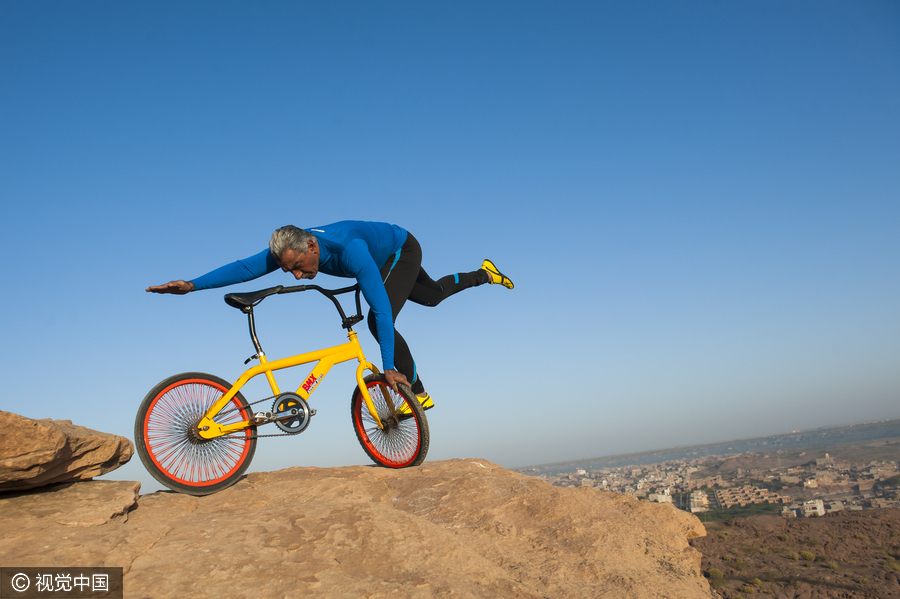 Khivraj Gurjar hace yoga en su bicicleta BMX al borde de una colina, cerca de Jodhpur, India, el 17 de diciembre del 2015. [Foto: VCG]