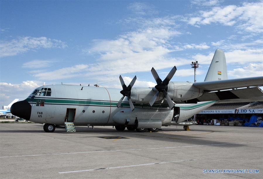 Un avión con los suministros de socorro que serán enviados a Haití se dispone a despegar, en un avión, en el Aeropuerto Viru Viru, en Santa Cruz, Bolivia, el 8 de octubre de 2016. El presidente boliviano, Evo Morales, inspeccionó el sábado el envío de un avión Hércules con 5 toneladas de leche y 5 toneladas de arroz para las familias damnificadas de Haití, luego del paso del huracán "Matthew", de acuerdo con información de la prensa local. (Xinhua/R. Martínez Candia/ABI)