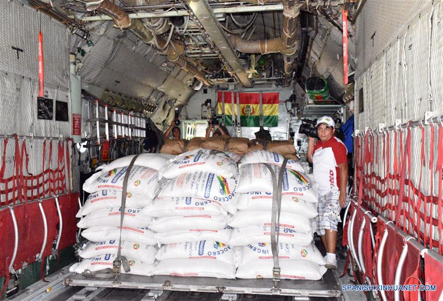 Vista de los suministros de socorro que serán enviados a Haití, en un avión en el Aeropuerto Viru Viru, en Santa Cruz, Bolivia, el 8 de octubre de 2016. El presidente boliviano, Evo Morales, inspeccionó el sábado el envío de un avión Hércules con 5 toneladas de leche y 5 toneladas de arroz para las familias damnificadas de Haití, luego del paso del huracán "Matthew", de acuerdo con información de la prensa local. (Xinhua/R. Martínez Candia/ABI)
