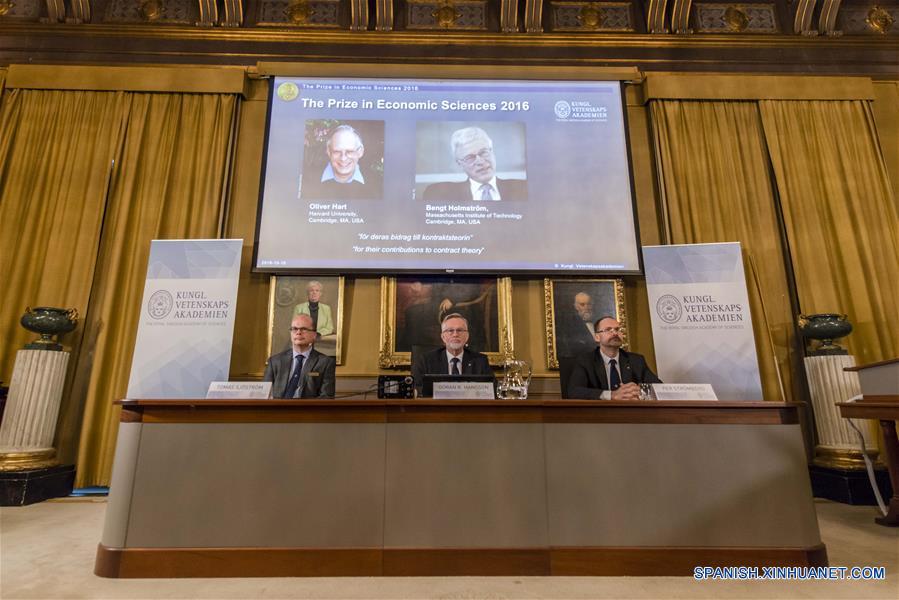 ESTOCOLMO, 10 oct (Xinhua) -- El premio Nobel de Economía 2016, oficialmente el Premio Sveriges Riksbank en Ciencias Económicas en Memoria de Alfred Nobel, fue otorgado de manera conjunta a Oliver Hart y Bengt Holmstrom "por sus contribuciones a la teoría de los contratos".