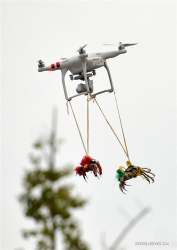 Dos cangrejos sobrevuelan en un dron durante un desfile de moda de cangrejos en el lago Hongze de Huai'an, provincia de Jiangsu, el 11 de octubre de 2016. El festival de cosecha del cangrejo mitón chino del lago Hongze se celebró este martes 11 de octubre de 2016. (Xinhua / Zhou Hongming)