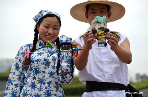 Dos personas muestran dos cangrejos decorados durante un desfile de moda de cangrejos en el lago Hongze de Huai'an, provincia de Jiangsu, el 11 de octubre de 2016. El festival de cosecha del cangrejo mitón chino del lago Hongze se celebró este martes 11 de octubre de 2016. (Xinhua / Zhou Hongming)