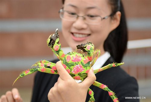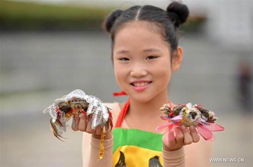 Una chica muestra dos cangrejos decorados durante un desfile de moda de cangrejos en el lago Hongze de Huai'an, provincia de Jiangsu, el 11 de octubre de 2016. El festival de cosecha del cangrejo mitón chino del lago Hongze se celebró este martes 11 de octubre de 2016. (Xinhua / Zhou Hongming)