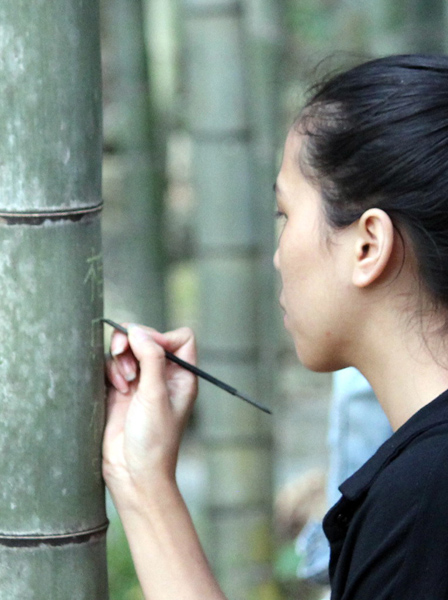 Una visitante escribe en un tronco de bambú en una zona habilitada para grafiti en la monta?a Jinzi de la provincia de Guangdong. Zeng Linghua / Para China Daily