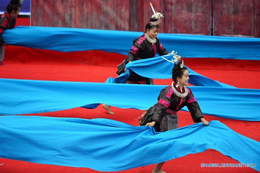 Artistas presentan trajes tradicionales del grupo étnico Miao, en el condado de Jianhe, provincia de Guizhou, en el suroeste de China, el 12 de octubre de 2016. Los equipos de 15 municipios bajo el condado de Jianhe participaron en el espectáculo para presentar trajes tradicionales. (Xinhua/Yang Wenbin)