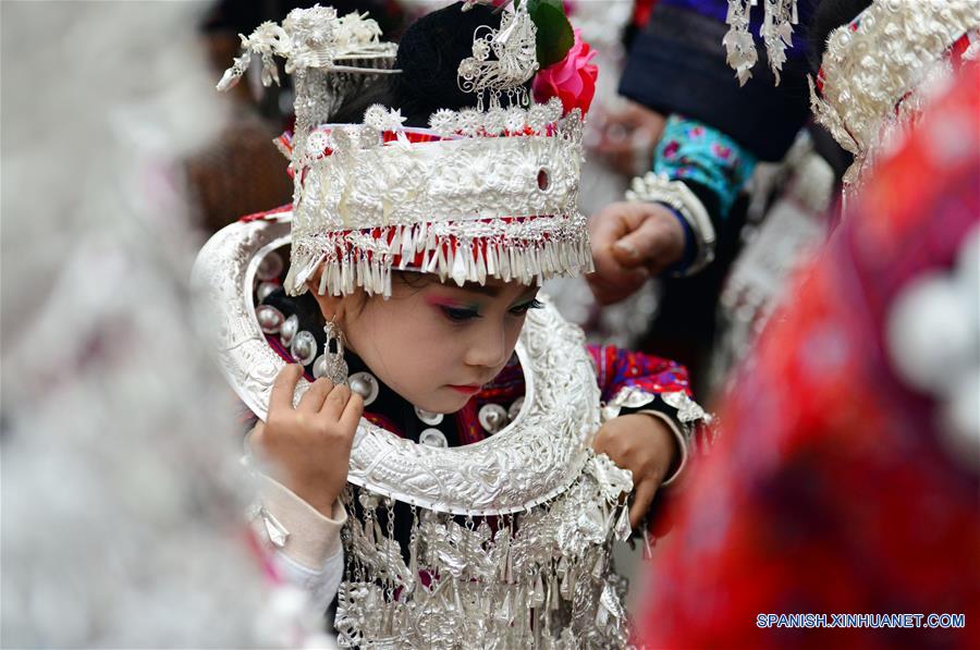 GUIZHOU, octubre 12, 2016 (Xinhua) -- Una artista presenta un traje tradicional del grupo étnico Miao, en el condado de Jianhe, provincia de Guizhou, en el suroeste de China, el 12 de octubre de 2016. Los equipos de 15 municipios bajo el condado de Jianhe participaron en el espectáculo para presentar trajes tradicionales. (Xinhua/Yang Wenbin)