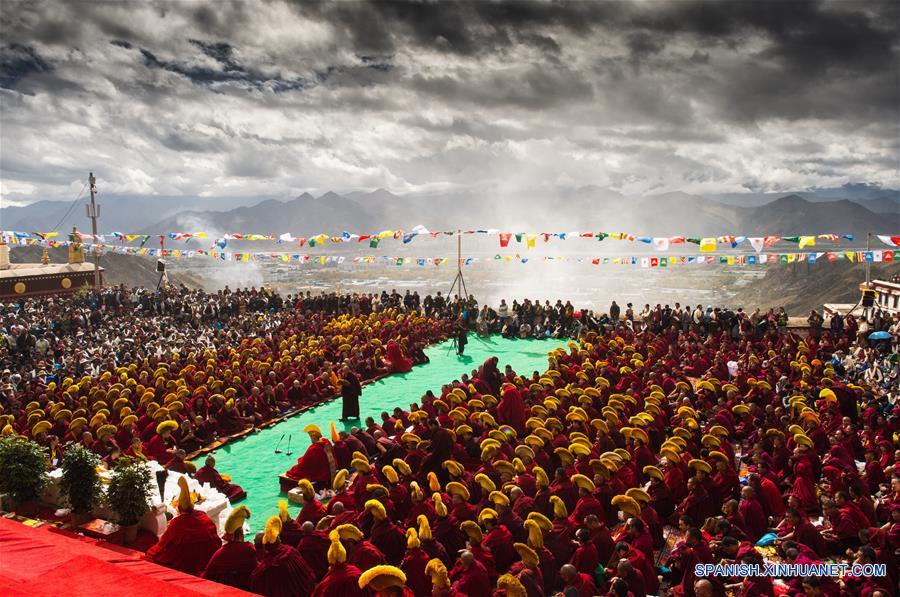 Una ceremonia es llevada a cabo con motivo del 600 aniversario de la fundación del Monasterio Drepung, en Lhasa, en la región autónoma del Tíbet, en el suroeste de China, el 12 de octubre de 2016. Construido en 1416 en las afueras de Lhasa, el Monasterio Drepung es el más grande e influyente monasterio de la secta Gelug, una rama del budismo tibetano. (Xinhua/Purbu Zhaxi)