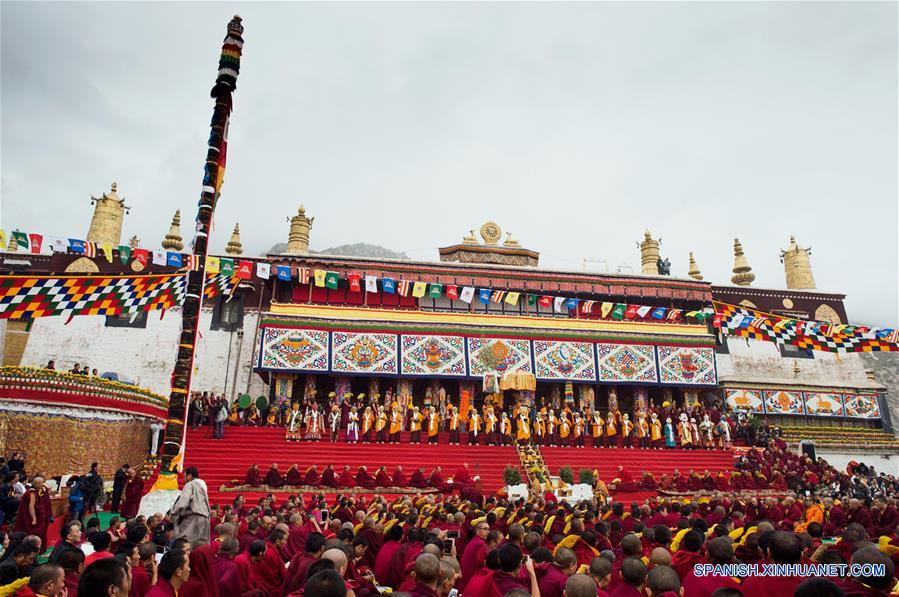 LHASA, octubre 12, 2016 (Xinhua) -- Una ceremonia es llevada a cabo con motivo del 600 aniversario de la fundación del Monasterio Drepung, en Lhasa, en la región autónoma del Tíbet, en el suroeste de China, el 12 de octubre de 2016. Construido en 1416 en las afueras de Lhasa, el Monasterio Drepung es el más grande e influyente monasterio de la secta Gelug, una rama del budismo tibetano. (Xinhua/Purbu Zhaxi)