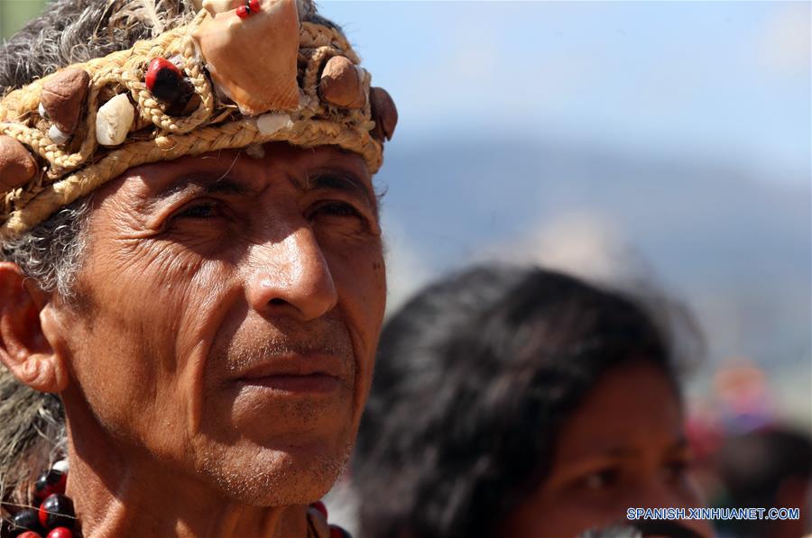 Un ciudadanos portando indumentaria indígena participa en la Marcha de la Resistencia Indígena en el marco de la conmemoración del Día de la Resistencia Indígena, en Caracas, capital de Venezuela, el 12 de octubre de 2016. En ocasión del Día de la Resistencia Indígena, el pueblo venezolano se movilizó en Caracas para manifestar su rechazo contra las pretensiones imperialistas contra la nación, de acuerdo con información de la prensa local. Los actos conmemorativos del 12 de octubre, Día de la Resistencia Indígena, coincidieron con la conmemoración del Día de la Raza, que se celebra en otros países de América. (Xinhua/Gregorio Terán/AVN)