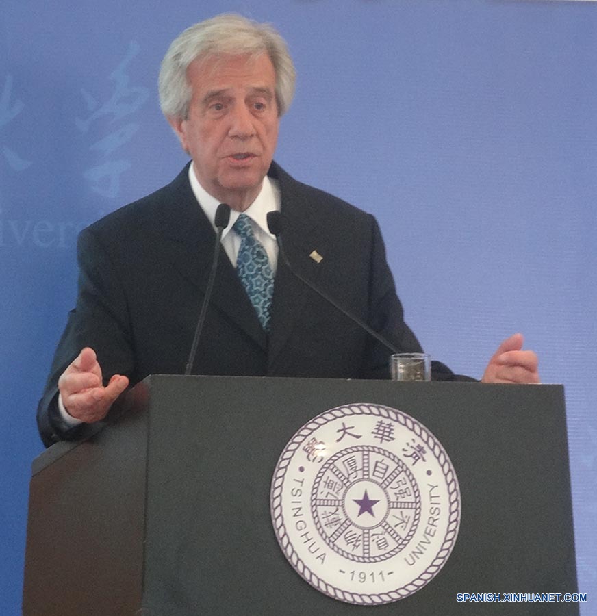 El presidente de Uruguay, Tabaré Vázquez, dio una conferencia ayer jueves en la Universidad de Tsinghua de Beijing para hablar de los peligros del tabaco y la experiencia de su país, que ha logrado reducir el consumo a través de medidas normativas. (Xinhuanet/Gong Xuemei)