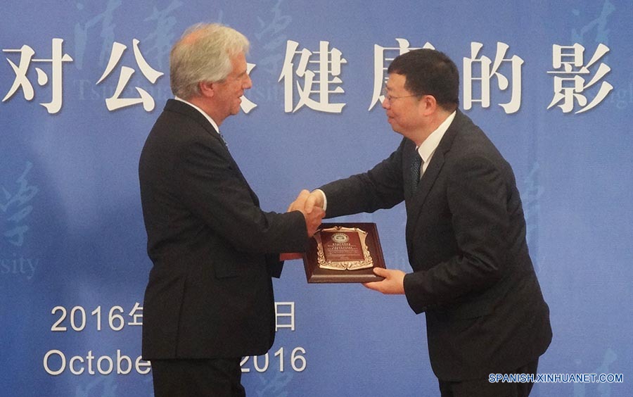 El presidente de Uruguay, Tabaré Vázquez, dio una conferencia ayer jueves en la Universidad de Tsinghua de Beijing para hablar de los peligros del tabaco y la experiencia de su país, que ha logrado reducir el consumo a través de medidas normativas. (Xinhuanet/Gong Xuemei)