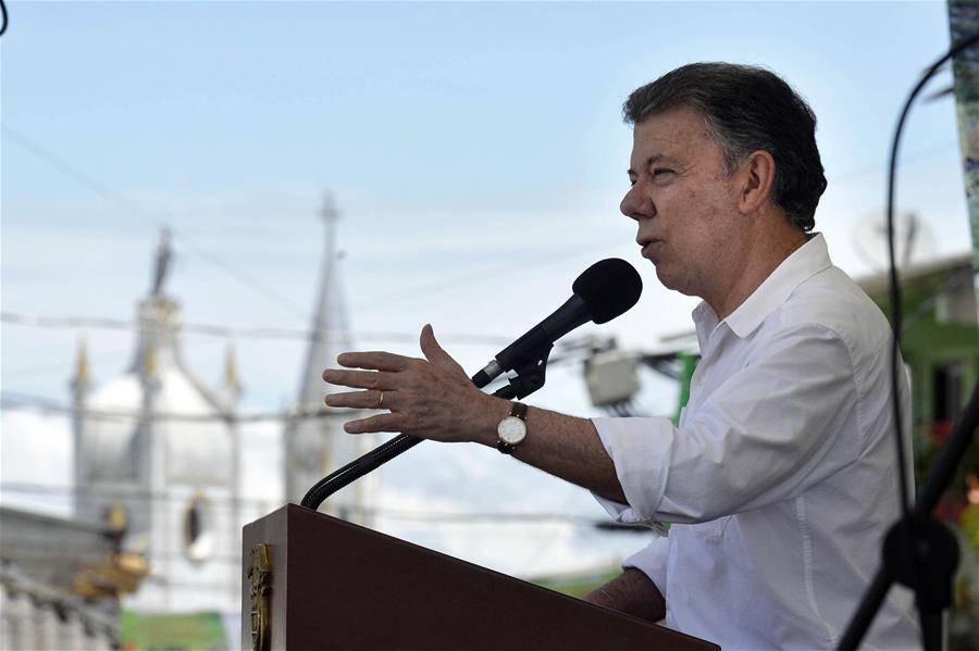 NARI?O, octubre 15, 2016 (Xinhua) -- Imagen cedida por la Presidecia de Colombia, del presidente colombiano, Juan Manuel Santos, pronunciando un discurso en la ceremonia de declaración de los municipios antioque?os de Nari?o, La Unión y Guatapé, libres de sospecha de contaminación de minas antipersonal y municiones sin explotar, en el municipio de Nari?o, departamento de Antioquia, Colombia, el 15 de octubre de 2016. El presidente colombiano, Juan Manuel Santos, declaró libres de minas los municipios de Nari?o, La Unión y Guatapé del departamento de Antioquia, el sábado durante la ceremonia. Juan Manuel Santos apreció el acto simbólico en el que ni?os de Nari?o representaron cómo el municipio se libera de la contaminación de minas antipersonal, de acuerdo con información de la prensa local. (Xinhua/Juan David Tena/Presidencia de Colombia)