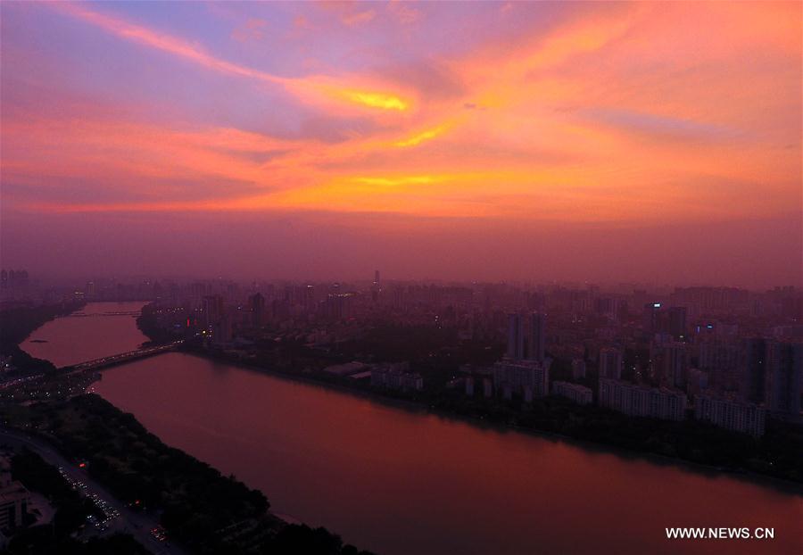 Nanning,18/10/2016 (El Pueblo en Línea) - Esta foto, tomada el 17 de octubre del 2016, muestra las nubes rojas en el oscuro cielo de Nanning, capital de la región autónoma de Guangxi, sur de China. (Foto: Xinhua/ Huang Xiaobang)