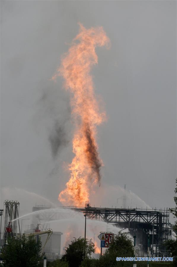 Una columna de fuego se levanta sobre las instalaciones de la compa?ía química BASF, en la ciudad de Ludwigshafen, Alemania, el 17 de octubre de 2016. Una persona murió y varias resultaron heridas el lunes a causa de una explosión ocurrida en la compa?ía de químicos alemana BASF en Ludwigshafen, indicó el servicio informativo alemán Spiegel Online. (Xinhua/Frank Rumpenhorst/DPA/ZUMAPRESS)