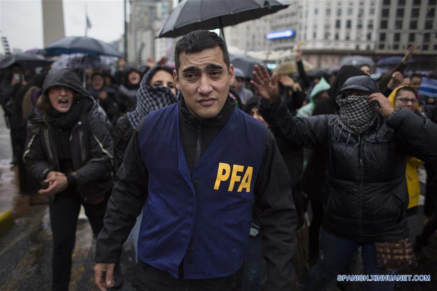 Personas participan durante el primer Paro Nacional de Mujeres y movilización bajo el título "Miércoles negro", en la ciudad de Buenos Aires, Argentina, el 19 de octubre de 2016. El colectivo "Ni Una Menos", Mujeres de la Matria Latinoamericana (MuMaLá) y otras organizaciones organizaron el miércoles el paro de mujeres y movilización bajo el título de "Miércoles negro" para decir basta a la violencia de género, convocando a las mujeres a vestirse de negro en se?al de luto, de acuerdo con información de la prensa local. (Xinhua/Martín Zabala)