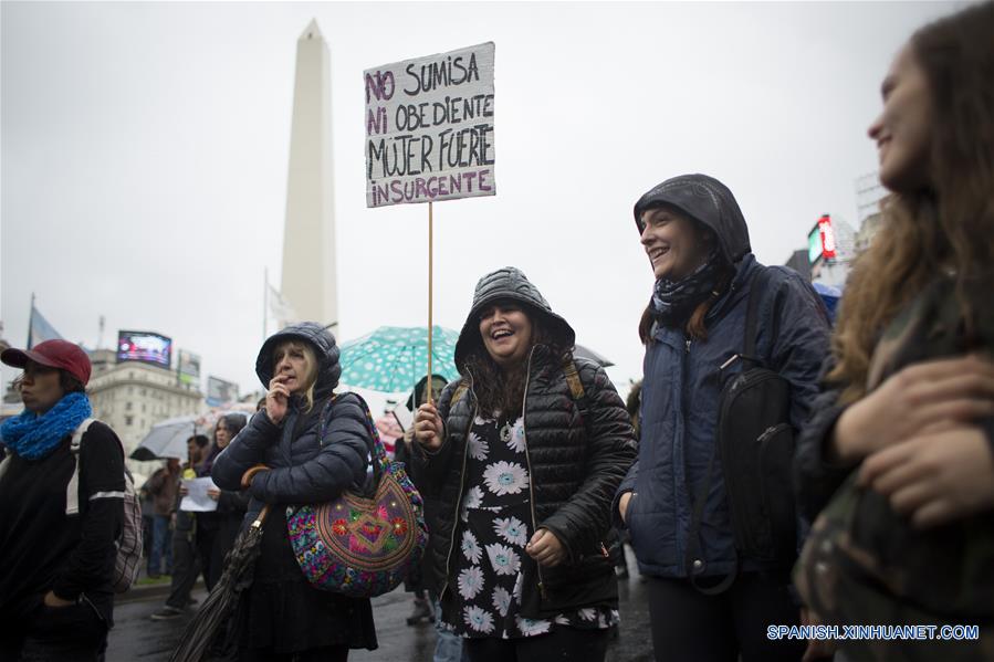 Mujeres participan durante el primer Paro Nacional de Mujeres y movilización bajo el título "Miércoles negro", en la ciudad de Buenos Aires, Argentina, el 19 de octubre de 2016. El colectivo "Ni Una Menos", Mujeres de la Matria Latinoamericana (MuMaLá) y otras organizaciones organizaron el miércoles el paro de mujeres y movilización bajo el título de "Miércoles negro" para decir basta a la violencia de género, convocando a las mujeres a vestirse de negro en se?al de luto, de acuerdo con información de la prensa local. (Xinhua/Martín Zabala)