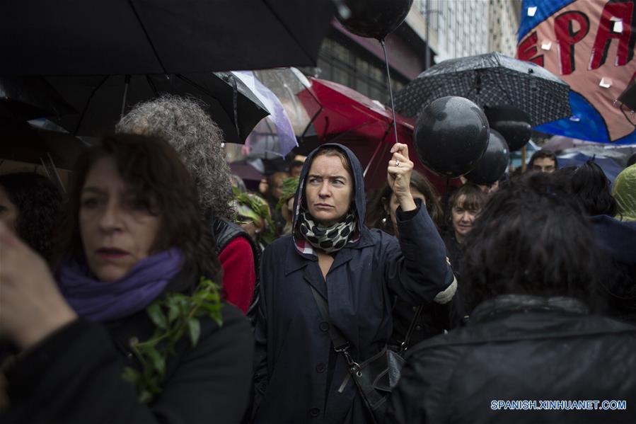 Mujeres participan durante el primer Paro Nacional de Mujeres y movilización bajo el título "Miércoles negro", en la ciudad de Buenos Aires, Argentina, el 19 de octubre de 2016. El colectivo "Ni Una Menos", Mujeres de la Matria Latinoamericana (MuMaLá) y otras organizaciones organizaron el miércoles el paro de mujeres y movilización bajo el título de "Miércoles negro" para decir basta a la violencia de género, convocando a las mujeres a vestirse de negro en se?al de luto, de acuerdo con información de la prensa local. (Xinhua/Martín Zabala)